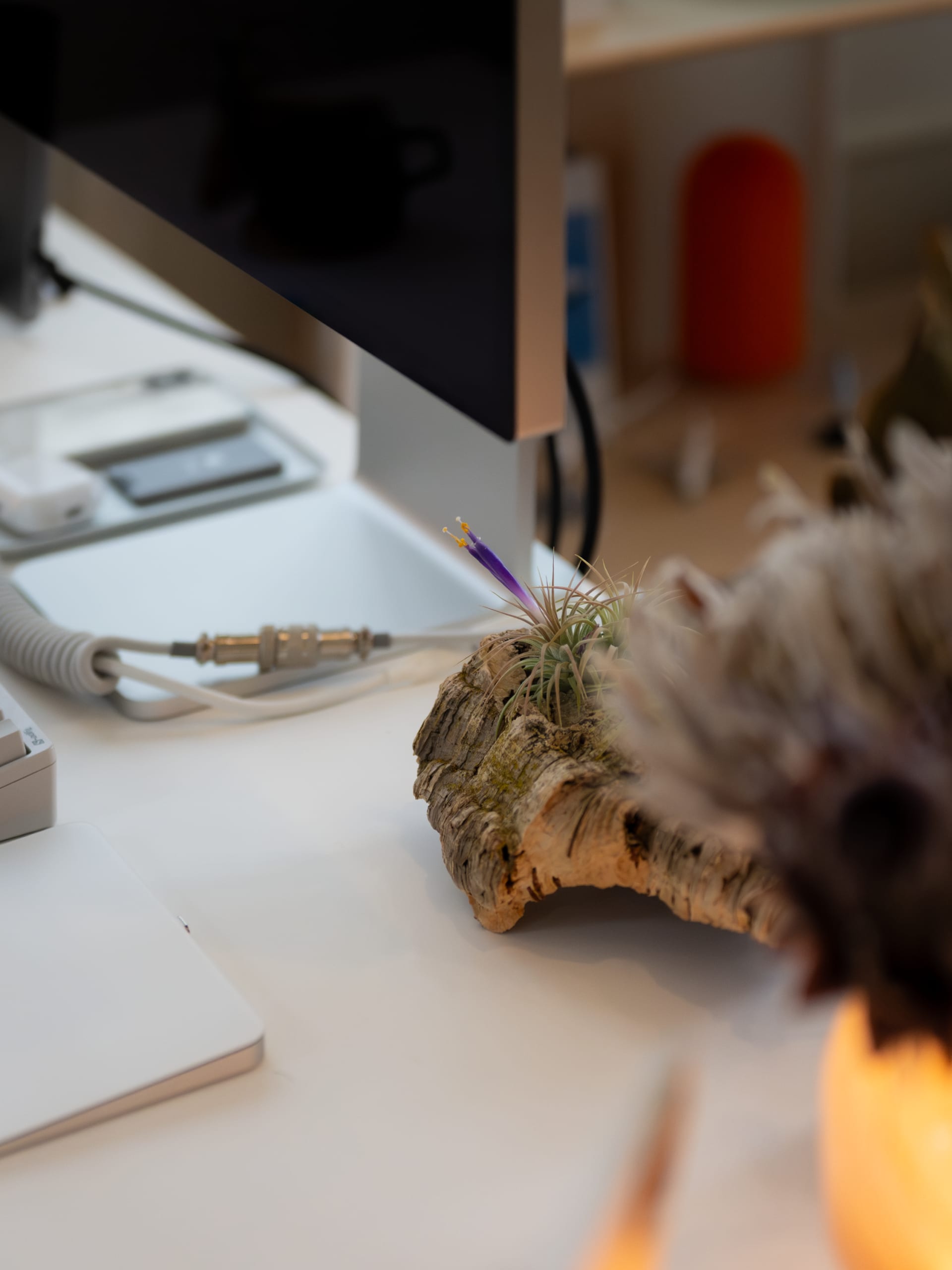 他方で、植物に関しては特にデスク周りは土が不要なエアプランツを選んで置いています。PC作業をする場所の近くに土があるのは少し抵抗があるので、グリーンの繊細な印象を持ちながらも扱いやすいという意味で、エアプランツはちょうどいい選択肢なんです。