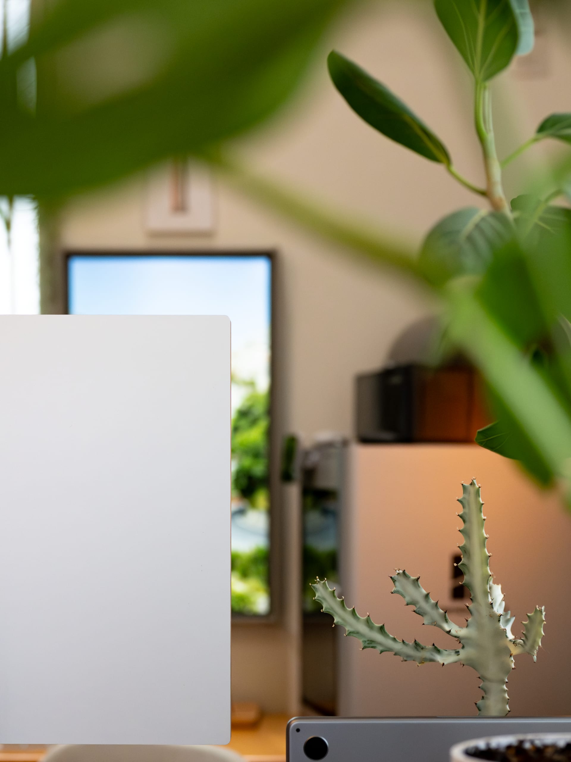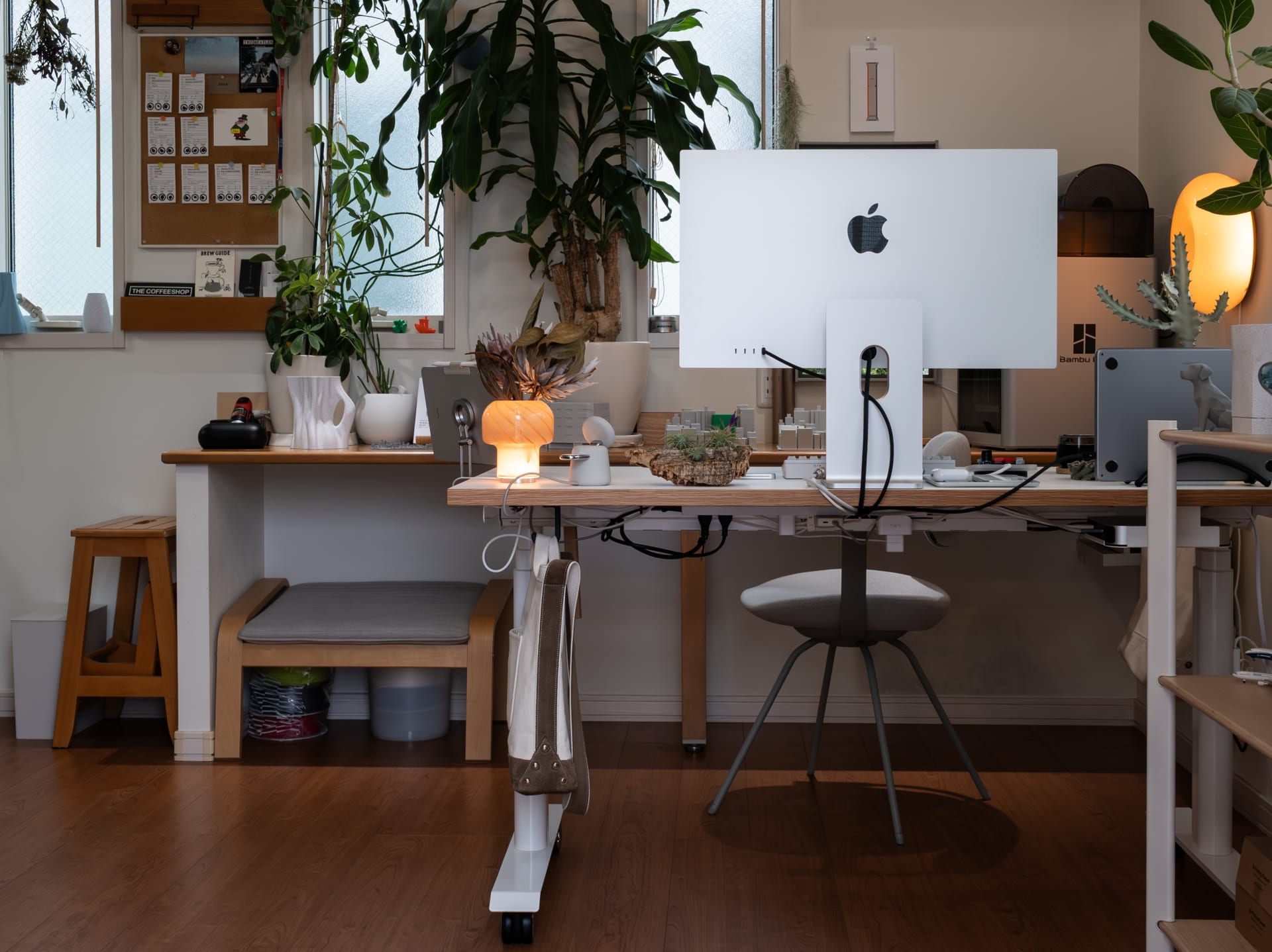 植物とガジェットのバランス感覚でしょうか。機能性に振り切ってしまうと見た目が野暮ったくなり、一方で見た目を重視するとワークスペースとして不便な点が出てくることもあるので双方ちょうどいいバランスを探って今に至っています。