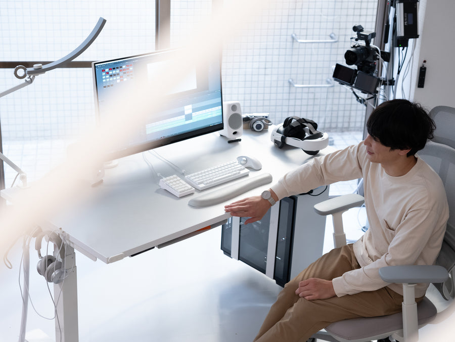 ホワイトの昇降脚に合わせ、ホワイトの小口と、表面は反射が少なく傷に強いメラバイオ®高圧メラミン化粧板を採用しています。