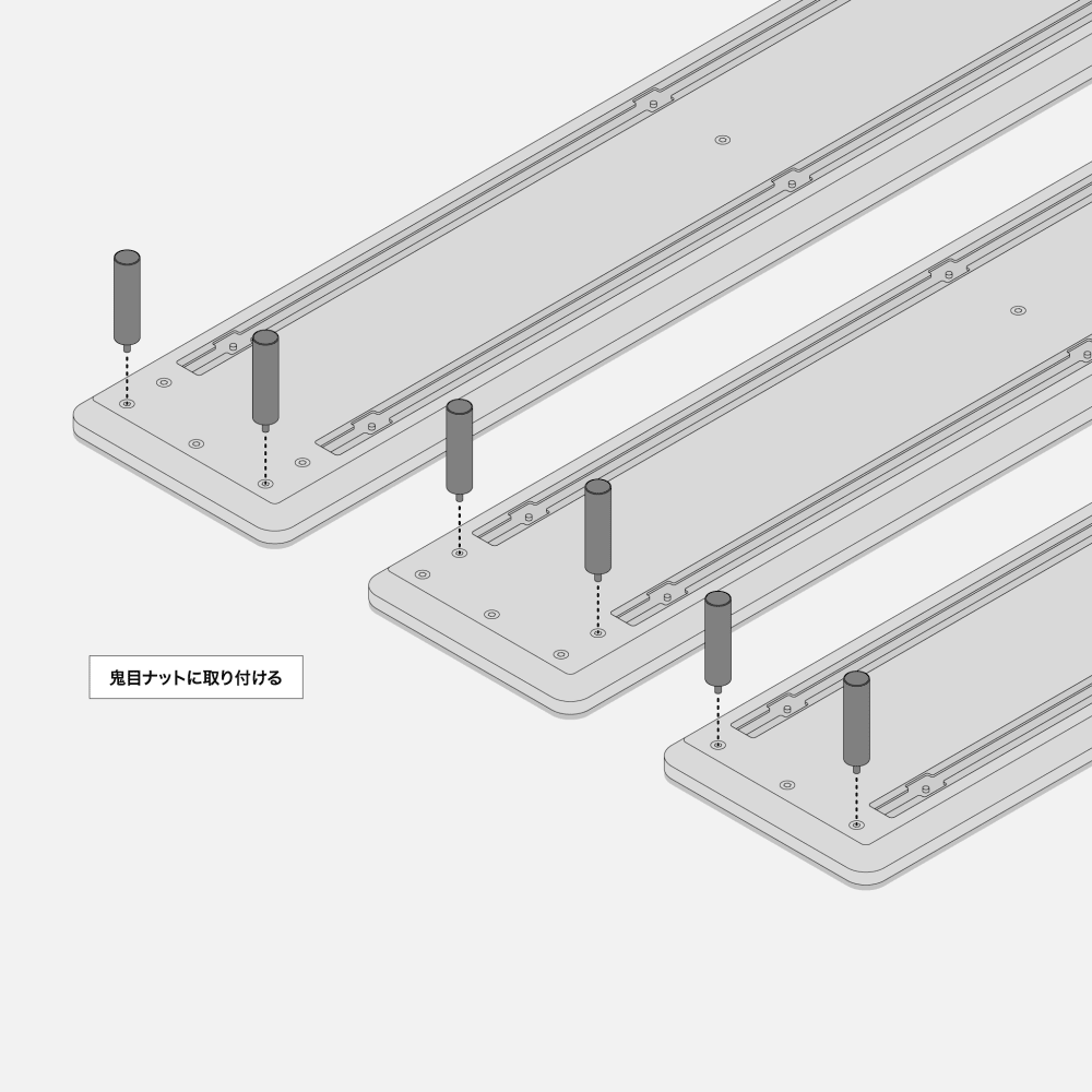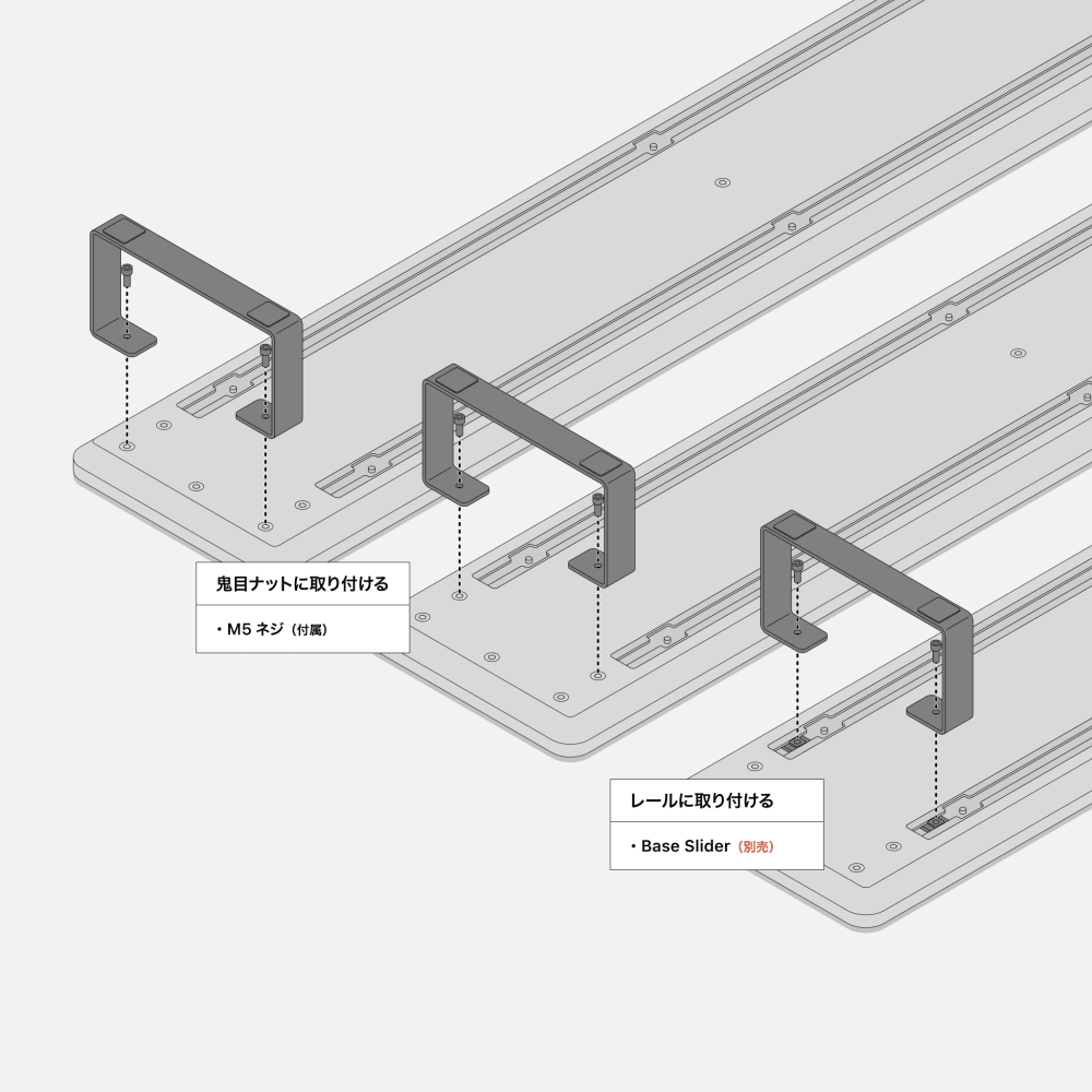DASHBOARD 120cm,140cmモデルは3通りの取り付け方法に対応します。鬼目ナットに取り付ける場合はSteel Legに付属するM5ネジをご利用ください。レールに取り付ける場合は別売りのBase Sliderをご用意ください。