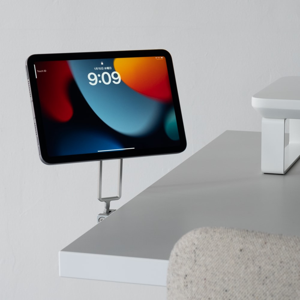 「ボール形状で全方位に自由に動くジョイント」と「ヒンジ形状で一方向で開閉できるジョイント」を組み合わせたアーム型モジュールです。デスク上で単に「固定」するのではなく、アームによって「動かせる」ことで、座り位置や仕事内容に合わせてその都度最適な位置に仕事道具を配置できます。