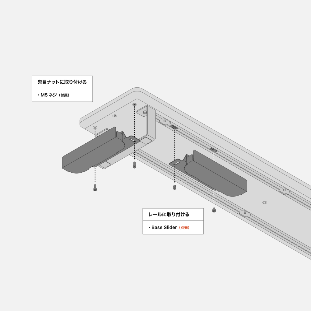 Swtich 2 Mount for DASHBOARDには2通りの設置方法があります。DASHBOARDの短辺には付属のM5ネジで取り付けることができます。レールに取り付ける場合は別売りのBase Sliderが2個必要になります。