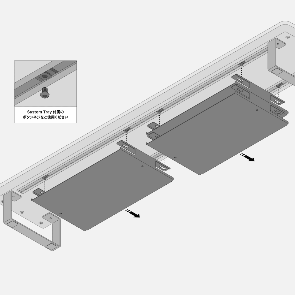 二段で設置する場合にはあらかじめSystem Tray同士を固定した上で設置してください。(二段にする場合にはSystem Trayのパッケージに付属するネジで固定してください)