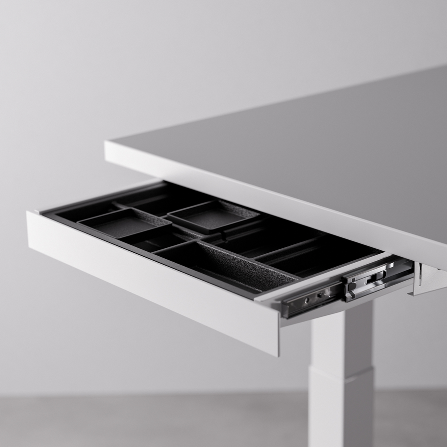 Drawer Inner Saucerを使うと、引き出し内を2階建てにすることも可能。デスク周りで使う細々したものの定位置としても、一時的に逃がす場所としても便利に使えます。またInner Saucerは可動式なので、下のものが取り出しづらくなる心配もありません。