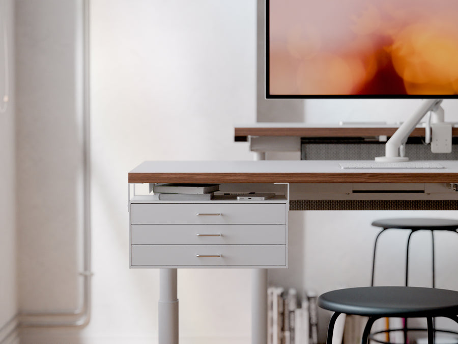 引き出しを3段備えたDrawer Three。文具や工具類などを数多く必要とする作業はもちろん、A4クリアファイルも収まるので紙類の多いワークスタイルにもマッチ。デスクの収納力を大きく向上してくれるモジュールです。